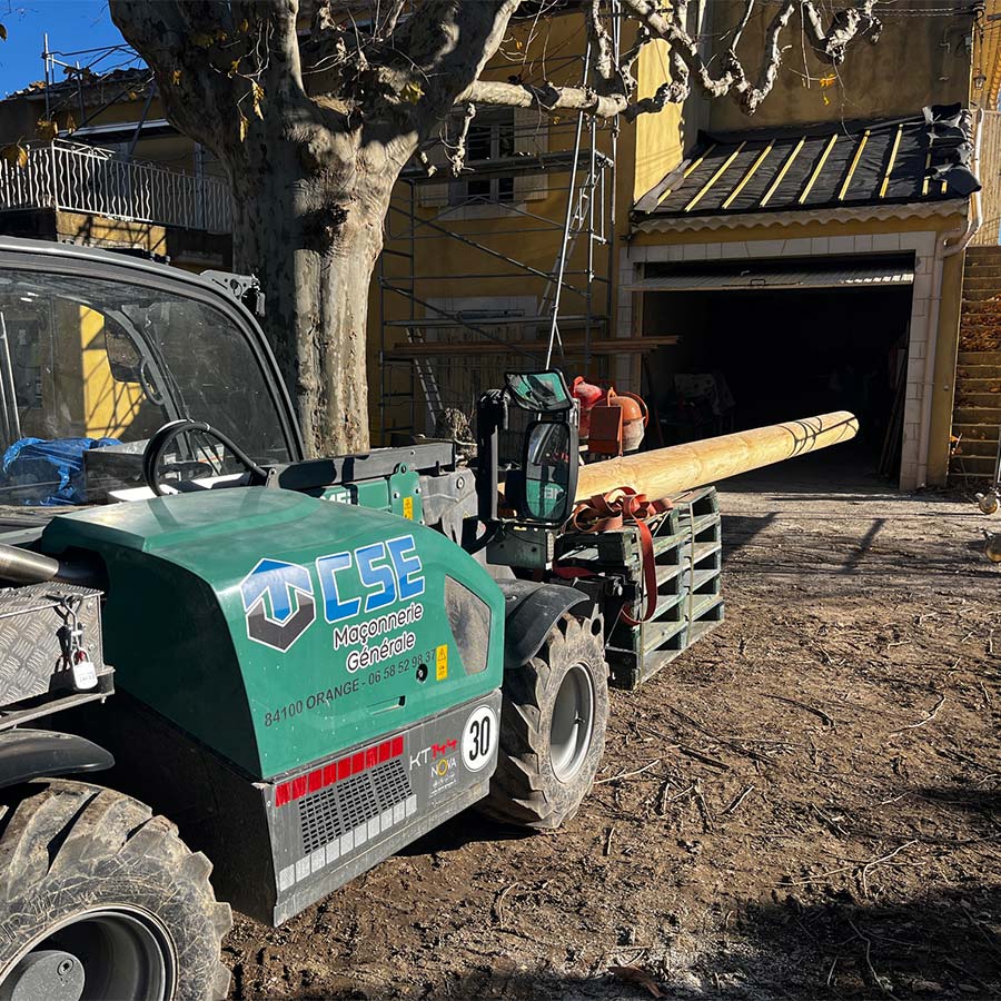Sur ce projet, l’enjeu principal reposait sur la difficulté d’introduire les poutres neuves dans un espace étroit. Étant donné leur longueur et leur diamètre, leur manipulation exigeait expérience et précision. À l’aide de notre engin de levage spécialement adapté aux chantiers délicats, CSE Maçonnerie a pu les acheminer jusque dans l’habitation. Ce travail met en avant l’expertise d’un maçon habitué aux chantiers complexes et aux contraintes de bâtiments anciens.